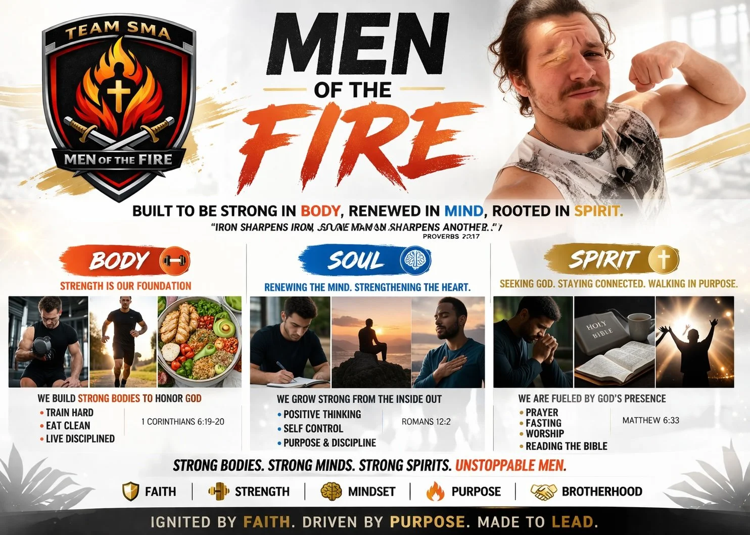 Men of the Fire (SMA) is a brotherhood of men committed to being refined by God, strengthened through discipline, and called to lead in their homes, communities, and beyond.